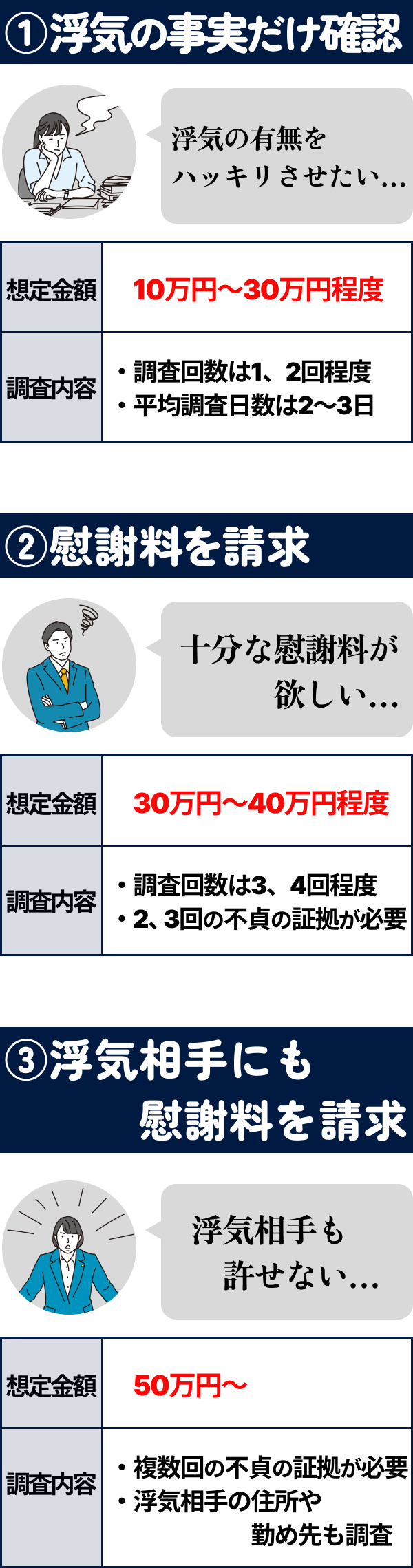 その理由を確認します。特に浮気調査の費用に幅がある理由は、浮気調査の費用を抑える方法にも通ずる話なので、要確認です。