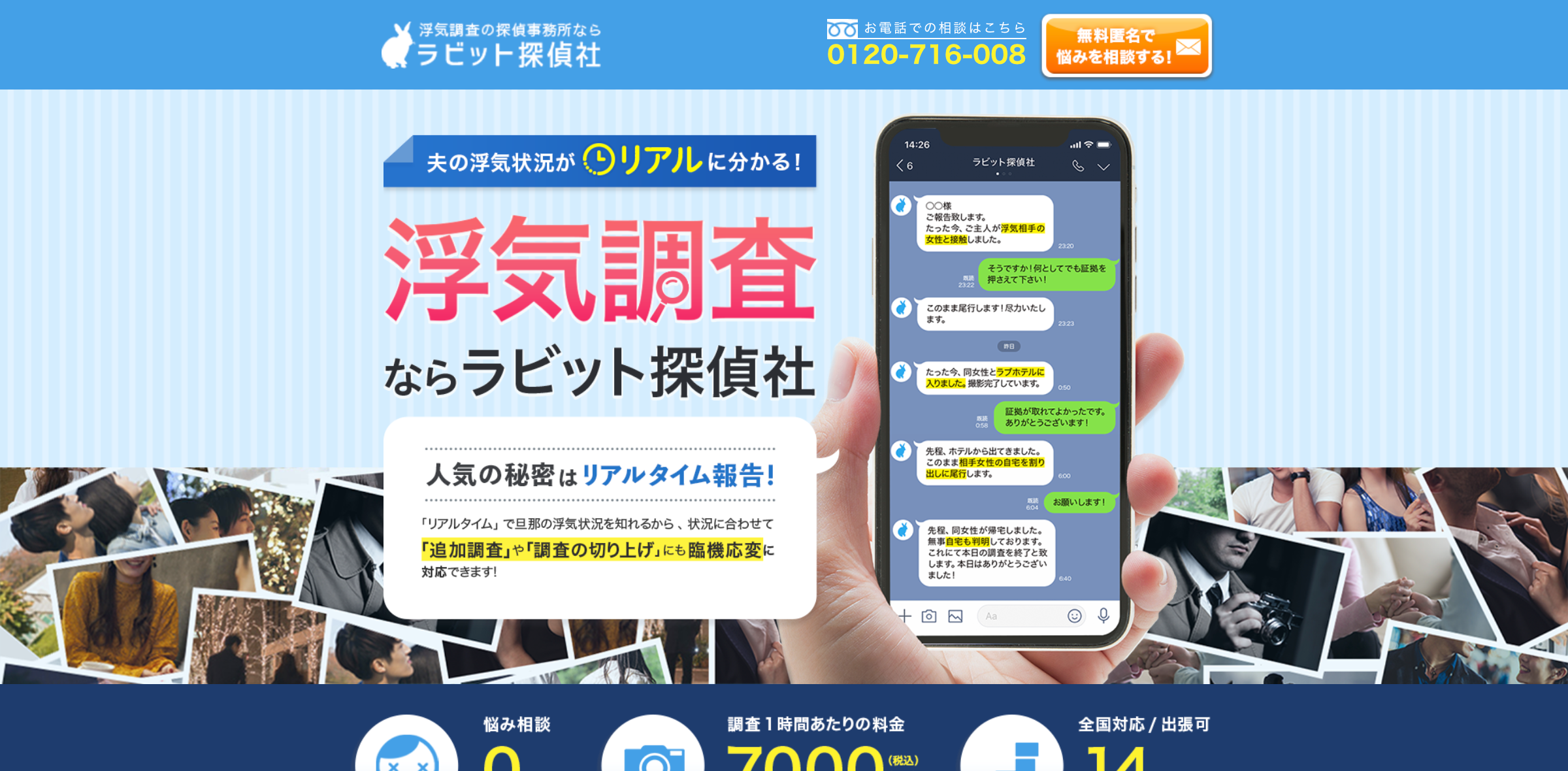 ラビット探偵社への相談の際には、必ず 「街角相談所の30%OFFクーポンを利用したい」とお知ら せください。通常の30%OFFの調査料金で依頼できます。