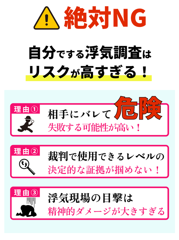 パートナーに浮気調査を気づかれてしまうと、十分な証拠を揃える前に警戒され行動パターンを変えられてしまったり、せっかく集めた証拠を消されてしまったりと状況が悪化する恐れがあります。
