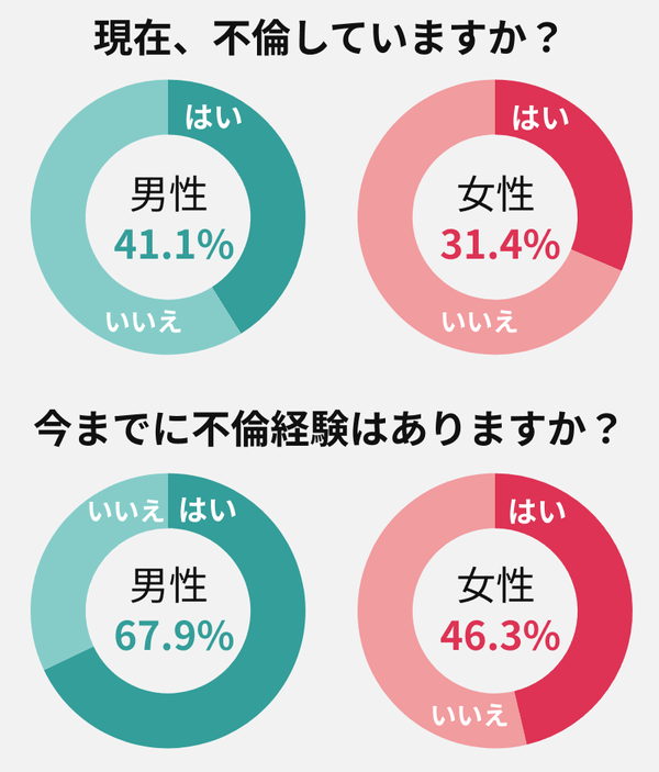 浮気経験があるのは「男性で約7割」「女性で約半数」と、パートナーを怪しいと感じたら高確率で浮気しているのが現状です。