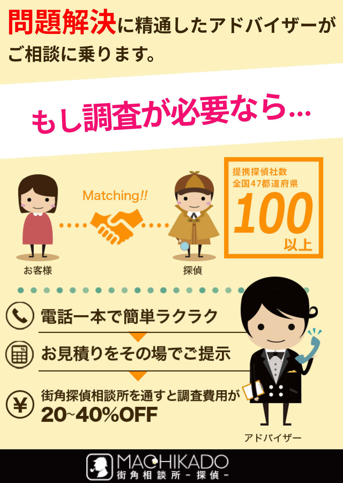あなたの悩みにあった 適切な調査費用 を算出して優良な 探偵社を紹介 してくれます。