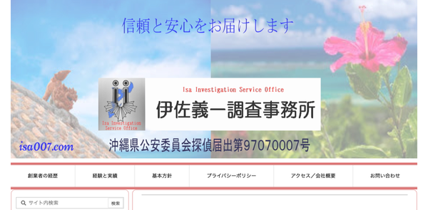 ![]() | 本社 | 沖縄県宜野湾市真栄原1丁目1番地1号 1階 | てだこ浦西駅より車で10分 | - | - | - | https://isa007.com/ | 沖縄県公安委員会探偵業届出第97070007号 | |