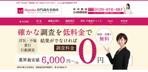 ![]() | 本社 | 神奈川県相模原市南区東林間3-19-7 | 小田急相模原駅 徒歩10分 | 24時間対応可 | 年中無休 | - | http://manaka-tantei.com/index.html | 神奈川県公安委員会探偵業届出証明書番号第45150034号 | |