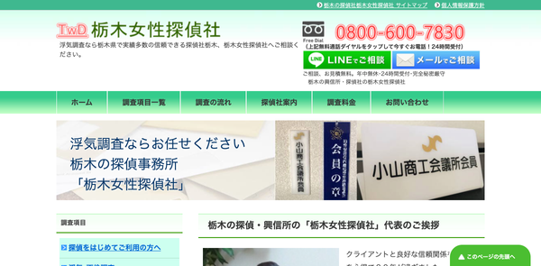 ![]() | 本社 | 栃木県小山市大字向野973-48 | 小田林駅より徒歩10分 | 24時間 | 年中無休 | https://tantei110.net/ | 栃木県公安委員会第41200009号 | |