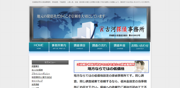 ![]() | 本社 | 茨城県古河市女沼397-1 秋山ビル | 古河駅より車で10分 | 24時間対応可 | 不明 | https://www.koga-tantei.com/index.html | 茨城県公安委員会届出 第40100019号 | |