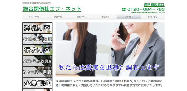 北関東自動車道 太田・桐生I・Cより12km。 | 24時間対応 | 年中無休 | http://www.f-net-kikaku.com/ | 群馬県公安委員会探偵業登録証番号42110008号 | |