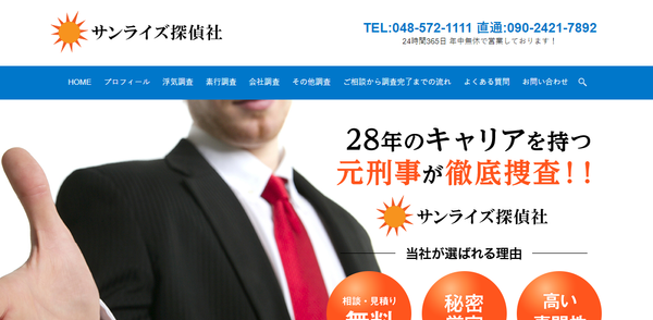 ![]() | 本社 | 埼玉県さいたま市見沼区東大宮4丁目1-2 203号室 | 東大宮駅 徒歩9分 | 9時〜24時 | 年中無休 | https://issey-tantei.com/ | 埼玉県公安委員会 第43170033号 | |