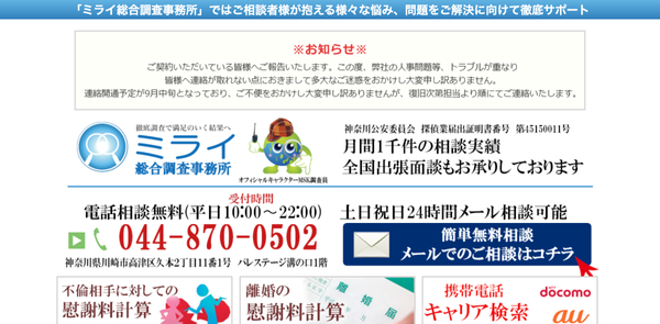 ![]() | 本社 | 神奈川県川崎市高津区久本2丁目11番1号 パレステージ溝の口1階 | 武蔵溝ノ口駅より徒歩10分 | 10:00~22:00 | - | - | http://www.soudan515.net/ | 神奈川県公安委員会探偵業届出 第45150011号 | |