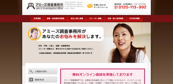 ![]() | 本社 | 北海道札幌市中央区北2条東1丁目2-10 北2条ビル(日宝北2条ビル)4階 | 札幌駅 徒歩14分 | 24時間対応可 | 年中無休 | - | https://www.ami-z.jp/ | 北海道公安委員会 (探偵業届出証明書)開始届出証明書番号 第10100057号 | |