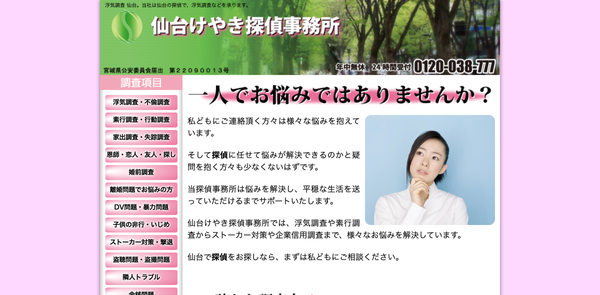 ![]() | 本社 | 仙台市青葉区上杉2丁目4番26号 パル上杉501 | 地下鉄南北線北四番丁駅より徒歩3分 | 24時間対応可 | 年中無休 | - | https://truthdetective.jp/ | 第2220016号 | |
