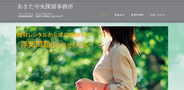 ![]() | 本社 | 秋田県秋田市仁井田横山162-2 | 横山下丁 徒歩10分 | 24時間対応可 | 年中無休 | - | https://www.akitatantei.com/ | 秋田県公安委員会 第23200007号 | |