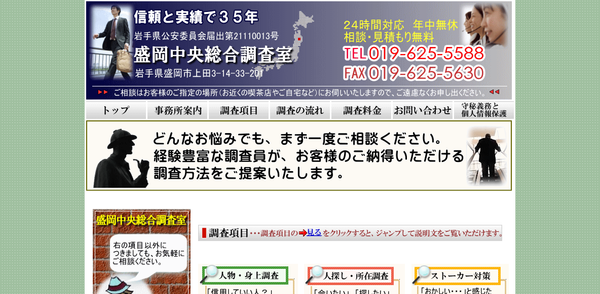 上盛岡駅より車で14分 | 24時間対応可 | 年中無休 | - | http://morioka-21net.com/tantei/index.html | 岩手県公安委員会届出 第21110013号 | |
