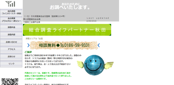 ![]() | 本社 | 秋田県大館市字向町8 コミュニテイ向町2A | 大館駅より車8分 | 24時間電話受付 | 年中無休 | - | http://www6.plala.or.jp/lifepartner_new/ | 秋田県公安委員会 探偵業届出証明 第23070003号 | |