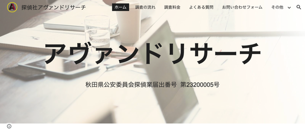 バス「県庁第二庁舎前」よりすぐ | 不明 | 不明 | - | https://www.avand-research.com/ | 秋田県公安委員会探偵業届出番号 第23200005号 | |
