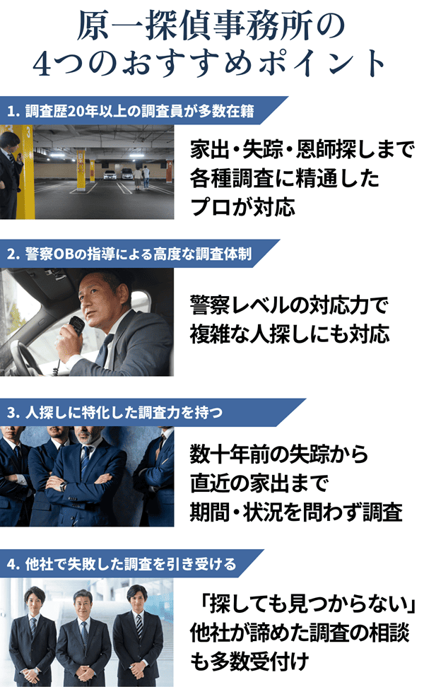 | MJリサーチ | 原一探偵事務所 | MR探偵事務所 | ラビット探偵社 | |