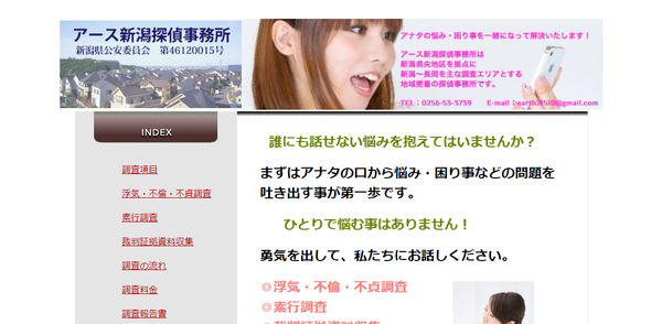 ![]() | 本社 | 新潟県新潟市中央区南笹口1丁目1-38 コープオリンピア笹口2F | 新潟駅 徒歩7分 | 24時間対応可 | 年中無休 | - | https://www.n-tantei.com/ | 新潟県公安委員会 届出番号 第46110011号 | |