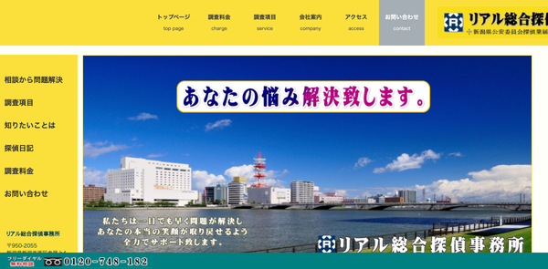 ![]() | 本社 | 新潟県新潟市西区寺尾上4-2-18高橋ビル2階 | 寺尾駅より徒歩6分 | 24時間 | 年中無休 | - | https://www.realsougoutantei.com/ | 新潟県公安委員会探偵業届出 第46120004号 |