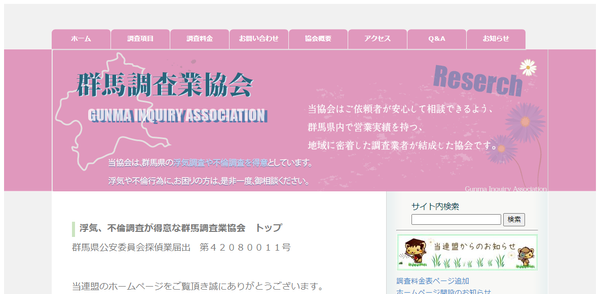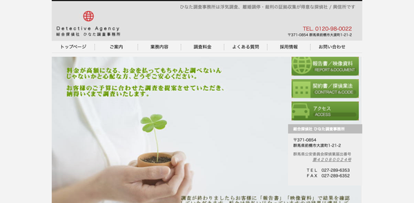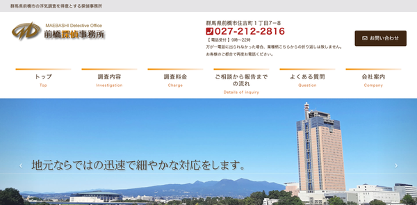 ![]() | 本社 | 群馬県前橋市富士見町時沢1858‐2 | 鳥居下(バス)より徒歩3分 | 24時間対応可 | 年中無休 | - | http://gunma-tantei.com/ | 群馬県公安委員会探偵業届出 第42080011号 |