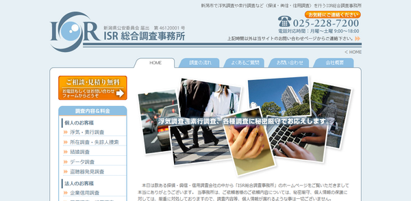 ![]() | 本社 | 新潟県新潟市中央区上大川前通六番町1212-3 | 本町[中央区](バス)徒歩2分 | 電話:月〜土 9:00〜18:00 | 日曜日 | - | http://isr-office.net/index.html | 新潟県公安委員会 第46120001号 | |