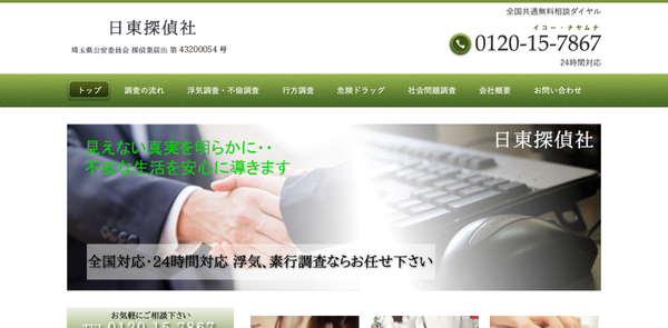 ![]() | 本社 | 埼玉県越谷市下間久里1064-1 | 大袋駅より徒歩4分 | 24時間 | 年中無休 | - | https://tantei-nito.com/ | 埼玉県公安委員会 探偵業届出 第43200054号 |