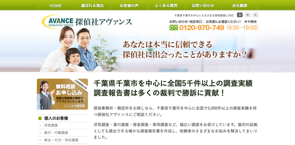千葉都市モノレール:栄町駅 徒歩7分・葭川公園駅 徒歩2分 | 24時間電話対応可 | 年中無休 | null | https://www.avance-in.co.jp/ | 千葉県公安委員会探偵業届出 第44170020号 | |