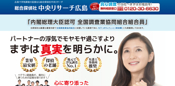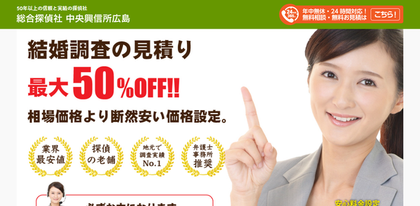 | 24時間対応 | 年中無休 | - | https://www.chu-ou.com/ | 広島県公安委員会探偵業届出証明書番号 第73070084号 | |
