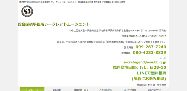 ![]() | 鹿児島支社 | 鹿児島県鹿児島市堀江町13番5号 SOHOドルチェ201号 | いづろ通駅 徒歩10分 | 24時間対応可 | 年中無休 | - | https://www.himawaritantei.com/ | 探偵業届出証明番号 鹿児島県公安委員会 第96130010号 | |