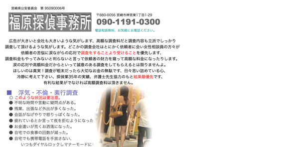 ![]() | 本社 | 宮崎市吉村町江田原307-4-302 | 9:00~17:00 | 土日 | - | http://miyazakitantei.com/ | 宮崎公安委員会第95140005号 | ||