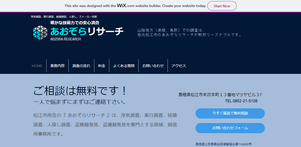 ![]() | 本社 | 島根県松江市末次本町13番地マツヤビル3F | 松江駅 徒歩19分 | 24時間対応可 | 年中無休 | - | https://www.aozora-r.com/ | 島根県公安委員会探偵業届出第71140002号 | |