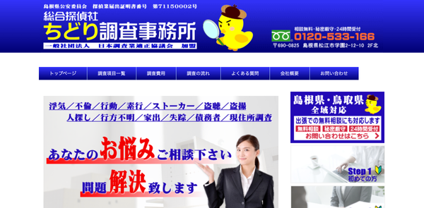 ![]() | 本社 | 島根県松江市学園2-12-10 2F北 | 島根大学前(バス)徒歩1分 | 24時間対応可 | 年中無休 | - | http://chidori-chousa.com/ | 探偵業届出証明書番号 島根県公安委員会 第71150002号 | |