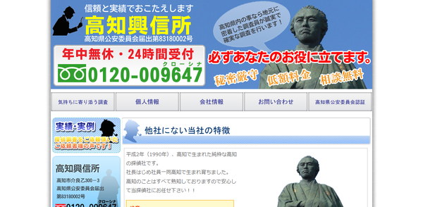 舟戸駅より車で4分 | 24時間対応可 | 年中無休 | - | http://www.kochi-koushinjo.com/ | 高知県公安委員会 探偵業 第83180002号 | |