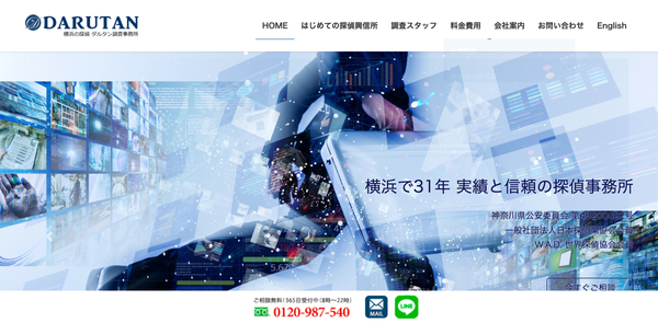 ![]() | 本社 | 神奈川県横浜市西区高島2-11-2 スカイメナー横浜409号 | 横浜駅 徒歩3分 | 24時間対応可 事業所:10:00〜19:00(土17:00) | 年中無休 事業所:日曜祭日休 | - | https://www.darutan.com/ | 神奈川県公安委員会 探偵業届出番号 第45200022号 | |