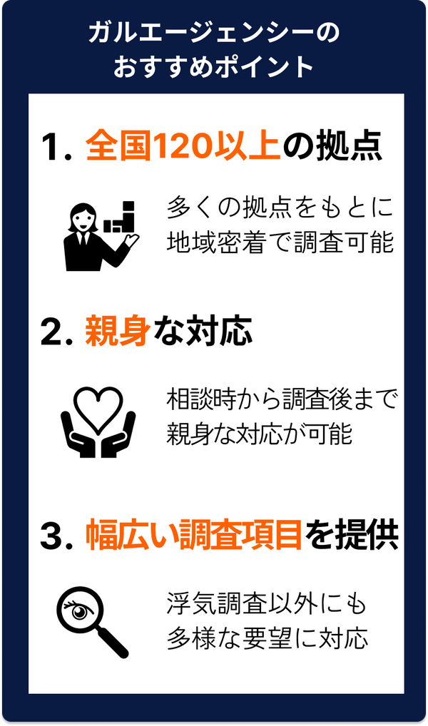 ガルエージェンシーはどのような特徴を持つ探偵事務所なのでしょうか?ガルエージェンシーの特徴は3つあるので解説します。