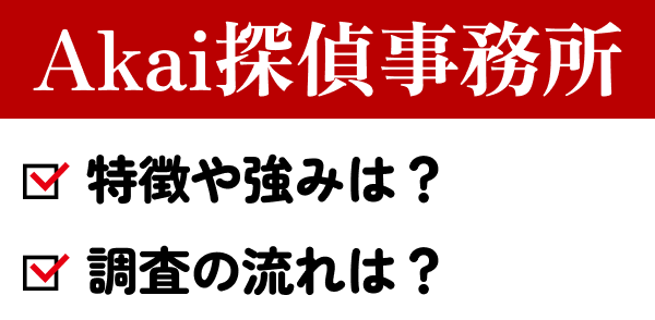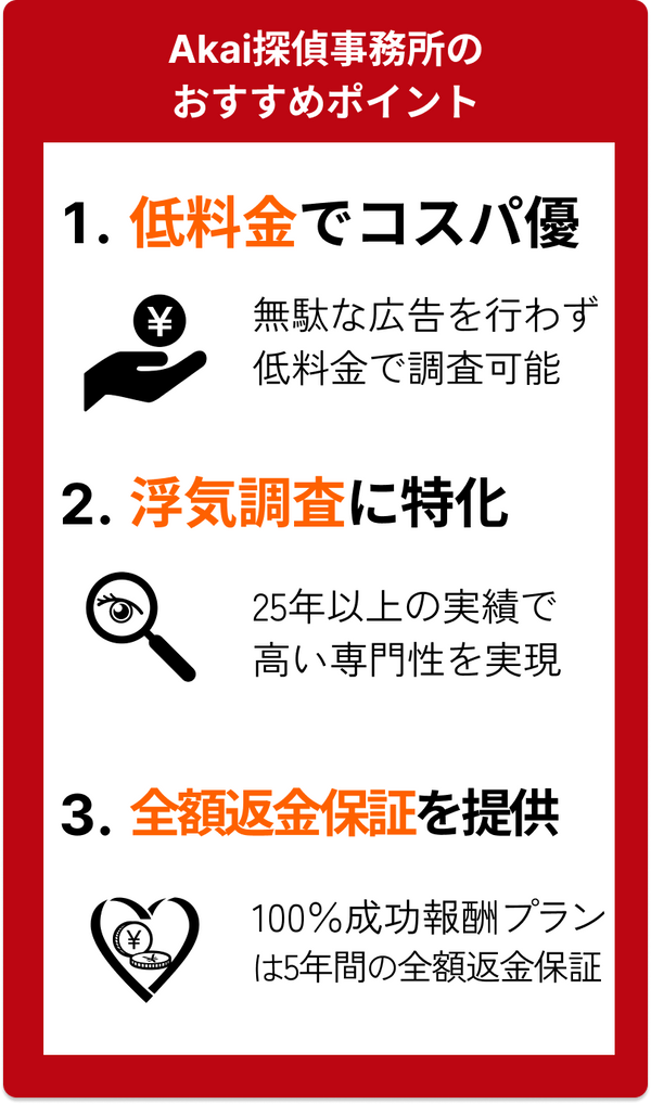Akai探偵事務所は、浮気調査に特化している探偵事務所です。浮気調査や素行調査など、行動調査に強い探偵が揃っているので、安心してお願いできます。