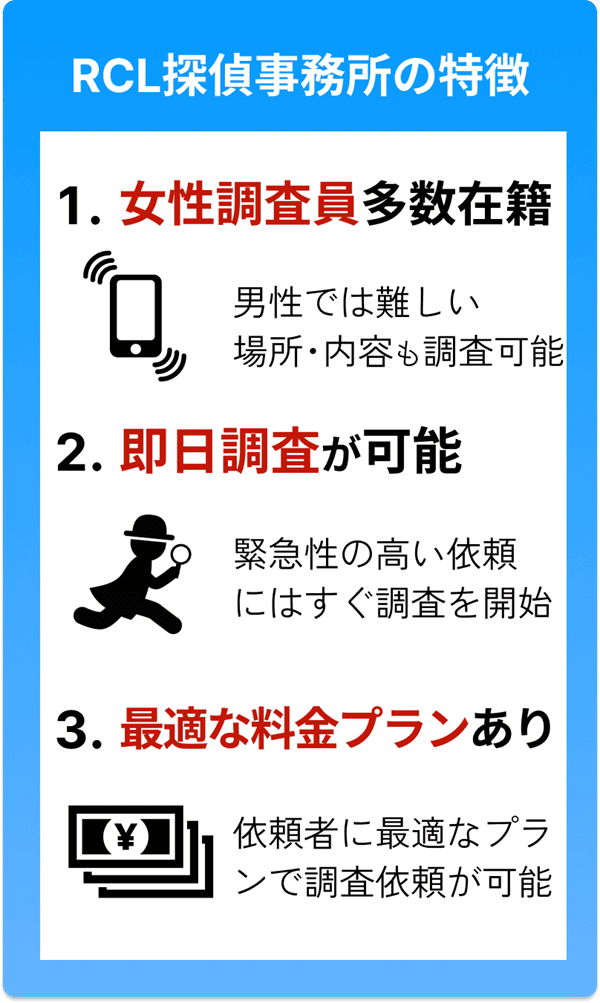RCL探偵事務所はどのような特徴を持つ探偵事務所なのでしょうか?RCL探偵事務所の特徴は4つあるので解説します。
