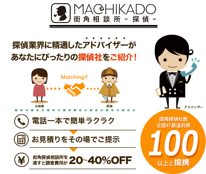 街角探偵相談所は探偵業界に精通したアドバイザーがお客様に最適な探偵社を紹介するサービスです。