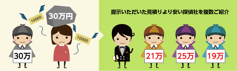 既にどこかの探偵社へご相談し、お見積りを取っている方は、そのお見積もりをご提示ください。ご提示いただけま すと、調査内容は変わらずにさらに安い費用で調査ができる探偵社をピックアップし、複数社ご紹介いたします。