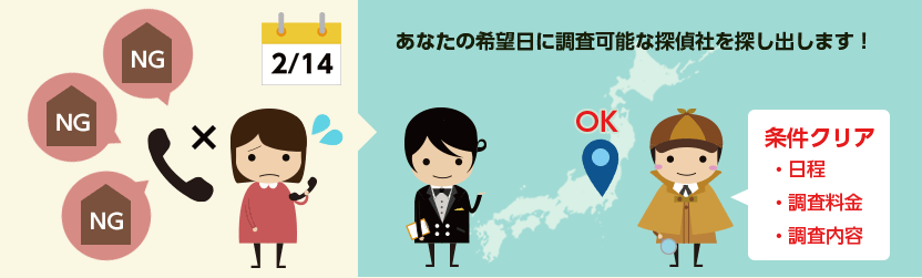 - ご紹介するのは弊社基準をクリアした信頼性の高い全国100社超の探偵社のみ