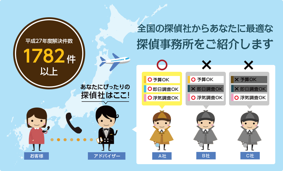 全国100以上の探偵社からあなたにぴったりの探偵社をお選びします。