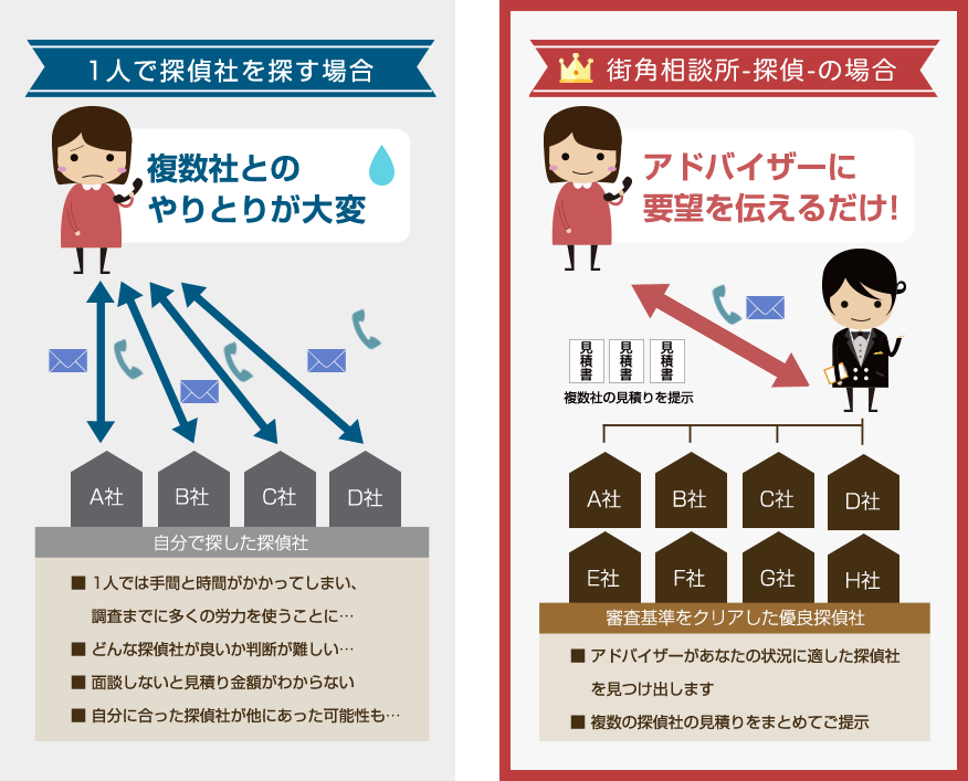 そこで街角相談所 -探偵- では、複数の探偵社の概算見積りをご提示の上、あなたに適した探偵社がどこなのかアドバイ スいたします。さらに、街角相談所 -探偵- からの御見積り依頼で各社定価から20~40%の割引が可能です。
